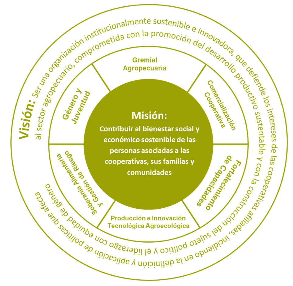 Ser una organización institucionalmente sostenible e innovadora, que defiende los intereses de las cooperativas afiliadas, incidiendo en la definición y aplicación de políticas que afecta al sector agropecuario, comprometida con la promoción del desarrollo productivo sustentable y con la construcción del sujeto político y el liderazgo con equidad de género.